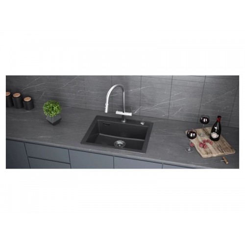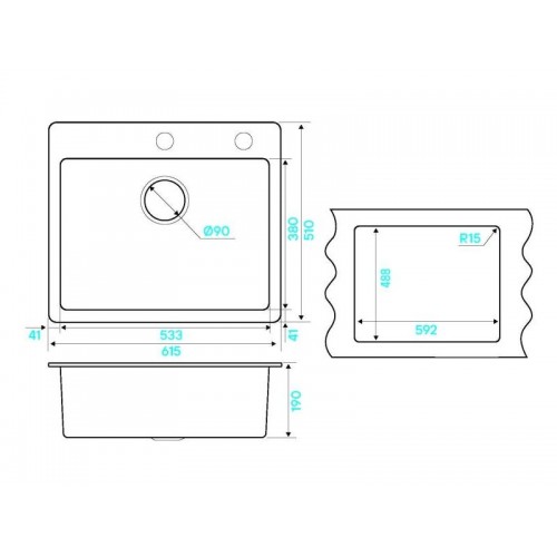 Описание Характеристики Материал - Керамика KeraPlus Мебельная база - 60 см Тип монтажа - Врезной  Вентиль-автомат Прямоугольный перелив Размер - 615х510 мм Цвет - Кристальный белый (KW) Метод производства - литье под давлением, обжиг Толщина материала ~14 мм. Глубина чаши 190 мм   Комплектация Комплект крепежа Вентиль-автомат Слив + Перелив Сифон с подключением ПММ Гофрированный шланг слива