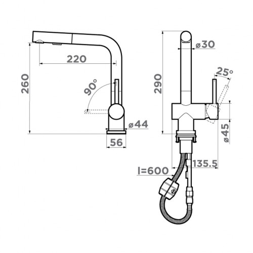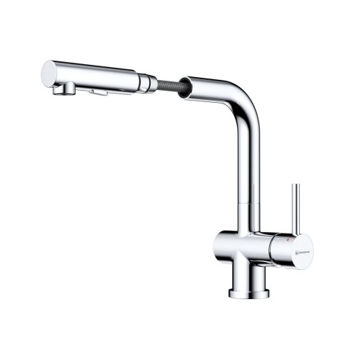 Смеситель произведен из высококачественной японской нержавеющей стали 18/8 — максимально экологичного материала для современного дома. Практичный однорычажный смеситель выполнен в современном стиле и снабжен высоким поворотным изливом и вытяжным шлангом. Кнопка переключения струя/душ Картридж: керамический ∅35 мм Подводка: гибкая, в оплетке из нержавеющей стали Особенности: угол поворота ручки может отличаться в зависимости от партии, вытяжной шланг до 600 мм Аэратор: пластик