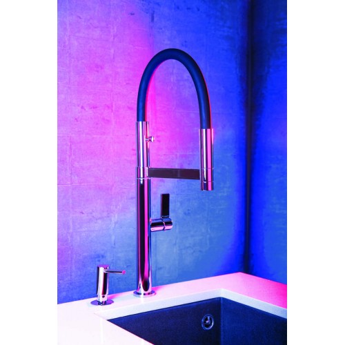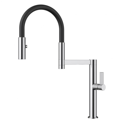 Длина высокого поворотного излива увеличивается по желанию за счёт шланга на магните.
