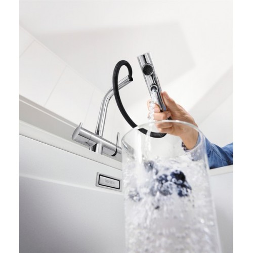 Описание Удобный смеситель 3-в-1-фильтрованная и обычная вода из выдвижного излива Раздельное управление: рычаг для холодной и горячей воды справа и рычаг для фильтрованной воды слева Гигиеничный: отдельный излив с дополнительным носиком для фильтрованной воды — нет смешивания с водопроводной водой Компактность и практичность: нет необходимости делать дополнительное отверстие для подачи фильтрованной воды Выдвижной излив с рассекателями для обычной и питьевой воды Превосходное сочетание смесителей с мойками и чашами BLANCO Угол поворота излива 180° Требуется отверстие под смеситель Ø 35 мм Керамический дисковый картридж Шланг выдвижного излива в нейлоновой оплетке Легкое подключение гибкими шлангами длиной 500 мм с гайкой 3/8“ Подходит для систем фильтрации воды с обратным осмосом Запатентованный рассекатель, уменьшающий отложение налета от воды Стабилизирующая пластина для увеличения устойчивости смесителя Возвратный клапан, предотвращающий возврат воды в соответствии с EN 1717