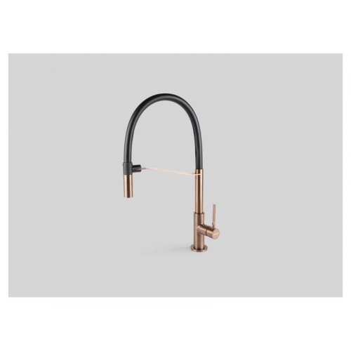 Описание Однорычажный смеситель для мойки с поворотным и регулируемым изливом. Соединительные шланги с внутренней резьбой 3/8 дюйма Отделка медь Диаметр выреза 35 мм