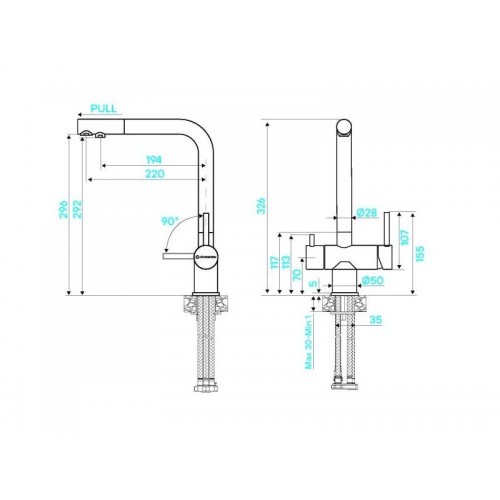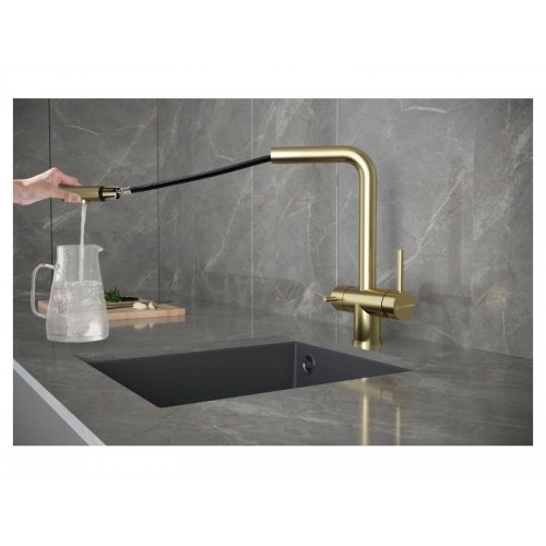 Описание Смесители из стали SUS 304 отличаются превосходной прочностью, антикоррозийной стойкостью прочностью к механическим повреждениям, устойчивостью к резким перепадам температур, абсолютной пищевой безопасностью Неоспоримым преимуществом смесителейиз стали SUS 304 является эстетичный и современный внешний вид Цветные модели KÜCHENSTERN с PVD  покрытием обладают повышенной износостойкостью, устойчивостью к агрессивным химическим веществам, что делает их максимально долговечными Даже при интенсивном использовании покрытие PVD не тускнеет и не теряет своего привлекательного внешнего вида на протяжении многих лет В процессе PVD не используются вредные химикаты, поэтому смесители экологически безопасны. Смеситель KÜCHENSTERN  FOKUS-FS  объединяет сразу две функции - питьевая и обычная вода из одного смесителя.  Смесителем удобно пользоваться , так как он имеет два отдельных рычага управления для водопроводной и фильтрованной воды. Материал: Нержавеющая сталь SUS 304 Высота: 326 мм Высота излива: 292 мм Длина излива: 220 мм Выдвижной излив Подключение фильтра Аэратор NEOPERL
